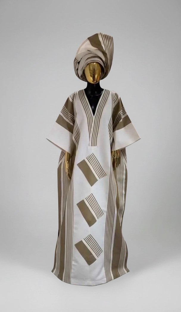 This kaftan is perfect for women who love clean lines, neutral tones, and timeless African-inspired elegance that never goes out of style.