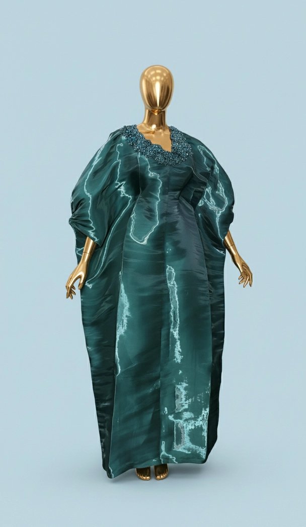 Radiate quiet luxury in this exquisite teal kaftan dress, designed to make a graceful yet powerful statement. Crafted from lustrous silk-like fabric with a fluid, reflective finish, this piece drapes beautifully over the body, creating an elongated and elegant silhouette.