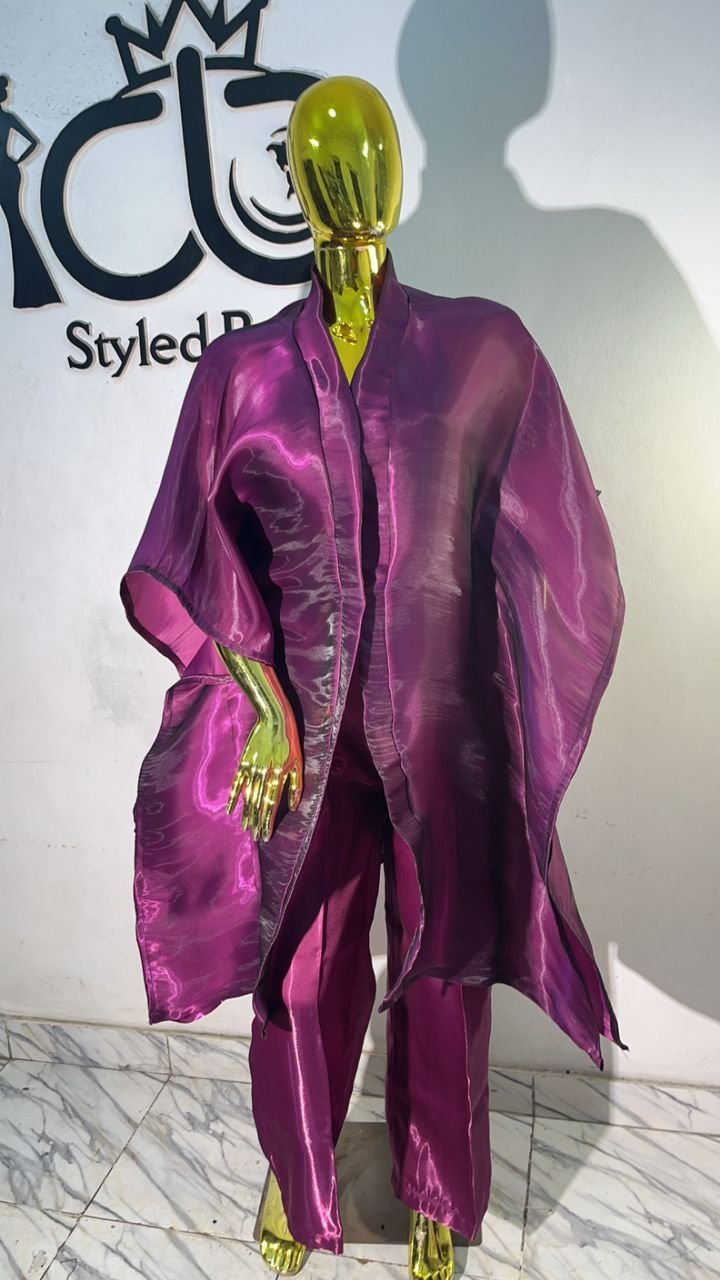 Elevate your style with this luxurious two-piece set featuring a sheer plum kimono jacket paired with sleek, matching satin pants. Designed for effortless sophistication, this outfit blends soft structure with fluid movement, making it a standout choice for modern, fashion-forward women.
