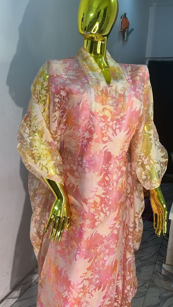 Embrace soft elegance with this beautifully crafted pastel floral midi dress, designed to flow effortlessly with every movement. Made from lightweight sheer fabric, this dress features a delicate blend of pink, peach, and soft green tones that create a romantic, airy look.