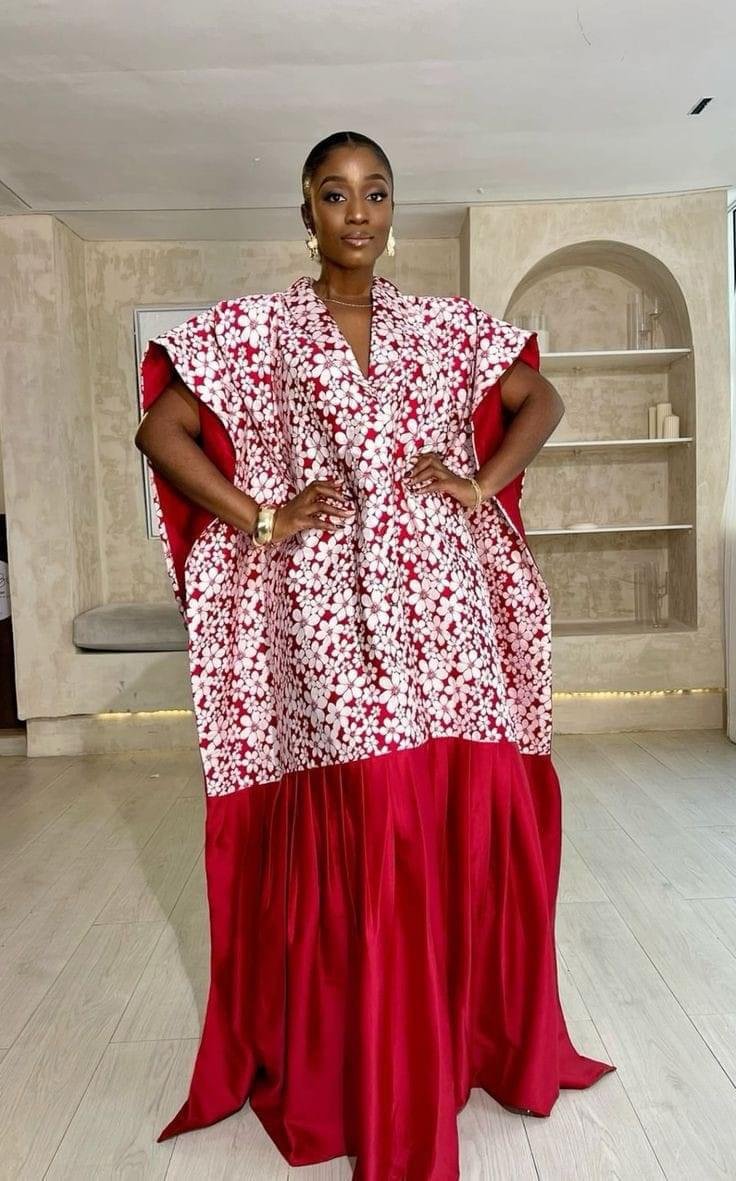 The kaftan overlay showcases a rich red base adorned with white floral prints, finished with wide sleeves and a relaxed, regal drape that flatters all body types. Beneath it, the soft, flowing red maxi skirt adds depth, movement, and drama, creating a beautifully layered silhouette that feels powerful yet effortless.